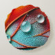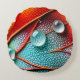 Esta fotografia macro impressionante captura o detalhe impressionante da asa de uma borboleta adornada com colírios de orvalho. A asa exibe um espetacular gradiente de cor, passando de vermelhos ferozes e laranjas vibrantes para uma legal e calmante tartaruga. Cada pequena escala cria um padrão celular intrincado, belamente ampliado pelas gotículas de água cristalinas que repousam sobre a superfície como joias preciosos. Esta imagem é uma celebração da beleza delicada, vibrante e, muitas vezes, invisível do mundo natural.