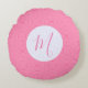 Round throw pillow made special with a pink initial inside a white fractal circle of squiggly squares. Background is light pink squiggly squares. Make a special room for mom or your favorite lady. Lovely Mother's Day or birthday gift.
