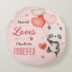 Este travesseiro lembra um adorável ursinho panda segurando balões em forma de coração com um espaço para escrever sua mensagem de amor.