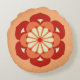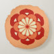 Travesseiro redondo de design de mandala japonês que retrata uma flor estilizada de lótus, simbolizando pureza, despertar espiritual e fidelidade - flor em laranja de mandarina profunda, laranja média e creme num fundo laranja pastel macio