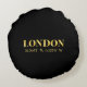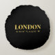 Design de travesseiro de sotaque redondo Lux apresenta coordenadas de mapas de Londres, Inglaterra e latitude e longitude em fontes douradas.