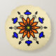 Este mandala único desenhado à mão apresenta um charme rústico e artístico com variações naturais no alinhamento do padrão. O vibrante design de explosão solar em laranja e azul cria um ponto focal impressionante para qualquer quarto."