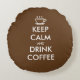 Brown mantem-se travesseiro decorativo redondo calmo e da bebida do café. O modelo de Personalizable para fazer seu próprio engraçado mantem a calma e continua a paródia. Tipografia do keepcalm do vintage com pouco copo de café pixelated. Criar sua própria paródia do keepcalmandcarryon. Decoração engraçada do café para o sofá ou a cadeira do sofá. Cor customizável/cor. O dobro tomou partido design.