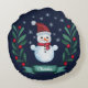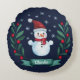 Travesseiro azul redondo de marinho de natal personalizado, com boneco de neve, flocos de neve e flores de inverno. Há também uma área onde você pode escrever qualquer coisa que quiser - nome, monograma ou qualquer outra coisa, muito fácil de editar e você pode escolher entre várias fontes diferentes, se quiser.