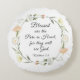 O travesseiro redondo de aspas inspiracional retrata uma simples coroa floral com flores rosas e brancas e cor-de-rosa e cor-de-rosa e verde. Ele apresenta uma parte dos Beatitudes, o amado ensinamento de Jesus do Sermão no Monte, Bíblia Verse Matthew 5:8, "Bênçãos são Pura no Coração, pois eles verão Deus."