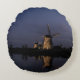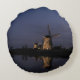 Travesseiro decorativo redondo com os moinhos de vento históricos iluminados com reflexão na água do rio durante a hora azul no início da noite em Kinderdijk nos Países Baixos.