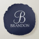 Almofada Redonda Monograma e Nome de Script Personalizado Azul-mari