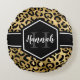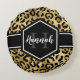 Ouro quico e travesseiro redondo preto-leopardo com nome personalizado e modelo de monograma. Um padrão de impressão animal de safari giro e tendencioso veio com seu próprio pedaço de personalização.
