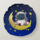 Moon Adventure Reversible Round Travesseiro - Um lado apresenta um astronauta posando de uma lua crescente, com estrelas ao seu redor, sobre um fundo de céus estrelados. O outro lado mostra Saturno, uma nave espacial em um percurso até Saturno, e uma estrela. Um travesseiro reversível divertido que seria excelente para a cama de um pequeno astronauta, especialmente quando combinado com um cobrir de Duvet da Aventura Lua correspondente.