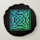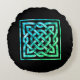 Um travesseiro redondo de um nó celta azul-esverdeado design contra um fundo preto.