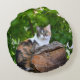 Um gato senta-se no jardim verde, próximo a um tronco e olha para frente - Dois lados diferentes