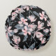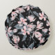 Um travesseiro redondo com um padrão elegante feito com uma ilustração aquarela de flores cor-de-rosa com folhas e caules de cinza azul. Fundo preto clássico atrás do padrão.