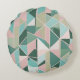 Um travesseiro redondo com um impressão geral de padrão geométrico minimalista em cores pastel tanto no lado traseiro como no lado frontal
