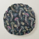 Este travesseiro redondo apresenta águas-vivas cor-de-rosa e lacrimejantes brilhantes que se movem graciosamente para cima através de um mar escuro, com anêmonas delicadas aninhadas aninhadas entre elas.