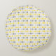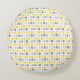 Travesseiro redondo decorativo com padrão amarelo e cinza.