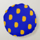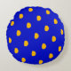 Este travesseiro mostra um padrão de pequenos pincéis de laranja amarelos arredondados bolinhas ok um fundo azul.