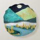 Uma bela paisagem com texturas únicas mostrando um rio e uma paisagem de montanha com lua ascensão e céu estrelado em tons de azul, ouro, verde escuro e amarelo.