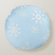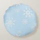 Cojín redondo con copos de nieve blancos sobre fondo azul – Decoración invernal elegante