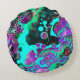 Arte fluida colorida abstrato roxo, azul, lacrimejo, travesseiro redondo preto.