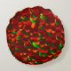 Ein rundes Dekokissen mit einem abstrakten Design von Rosenblättern, man lege seinen Kopf darauf und ist auf Rosen gebettet.