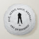 Recursos de design com citação de golfe fofa "Coma, Durma, Golfe, Repita! Alguma Dúvida?" em conjunto de texto circular clássico preto em um fundo realista de bola de golfe. Também em preto, uma silhueta de um golfista masculino fazendo putt está no centro do texto. A parte traseira apresenta um modelo para um nome personalizado ou texto curto em escrita preta elegante e correspondente. Todas as cores deste design, exceto a imagem da bola de golfe em si, podem ser facilmente alteradas para qualquer cor de sua escolha. Envie uma mensagem usando o botão na parte inferior desta listagem ou envie um e-mail para beachpausedesigns@gmail.com com quaisquer perguntas ou solicitações de opções de personalização.