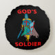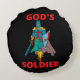 Este travesseiro redondo tem as palavras Soldado de Deus em uma impressão ousada mais letras vermelhas com um soldado em braço cheio ou segurando uma espada mais escudo no centro com um tema baseado na fé. Este travesseiro é feito com tecido de alta qualidade nossos travesseiros são macios e sem rugas, o cobrir é lavável por máquina.