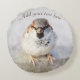 Imagem de um pardal que parece seriamente. Personalizável. Você pode alterar ou excluir o texto modelo conforme desejar e conforme necessário. Travesseiro redondo de algodão