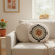 Linda travesseira redonda decorativa com rosto de sol da arte asteca e ilustrações com texto. Bela arte vintage com um estilo boho fusion. Adiciona um toque artístico e um sopro de cultura antiga à sua casa. Considere também como um presente estiloso para a casa nova de uma pessoa artística.