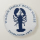 Travesseiro de lagosta redondo azul marinho e cinza com texto curvo e personalizado para uma casa de praia. Inclui o nome da família e o ano de fundação. Uma grande silhueta de lagosta no centro.