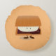 Um travesseiro de comida redondo com um sorriso de caráter mais sorridente com chocolate derretido levemente.
