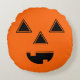 Este travesseiro decorativo festivo de Halloween aparece num impressão preto e laranja na face da abóbora. Forma redonda Personalize este travesseiro ou comprar como está.