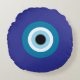 Este travesseiro azul redondo apresenta um design de mau de olhos em negrito na parte frontal e traseira.