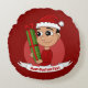 Travesseiro redondo com uma ilustração de um lindo menino feliz sorridente, ele está vestindo fantasia vermelha e branca do Papai Noel e segurando um presente; com um texto editável modelo para seu nome ou mensagem, design de Natal com fundo vermelho