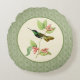 Travesseiro decorativo redondo com uma ilustração do vintage do colibri magnífico. Um colibri do verde e do ouro empoleira-se no ramo da planta tropical com as flores cor-de-rosa brilhantes; quadro e suportado com uma luz - cor damasco verde. Travesseiros decorativos quadrados de harmonização disponíveis.