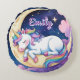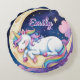 Doce travesseiro redondo com um unicórnio fofo descansando em uma lua crescente cercado por estrelas e nuvens. Personalize com um nome para uma ideia de presente única. Perfeito para quartos infantis, amantes pastéis e decoração ao estilo kawaii. Suave, colorido e mágico!