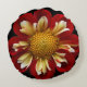 Destaque sua casa com este travesseiro decorativo redondo que mostra a foto de uma flor vermelha Collarette Dahlia com pétalas brancas e internas sobre fundo preto. Um design floral adorável! Selecione o estilo do tecido do travesseiro.