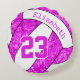 Este travesseiro personalizado de voleibol feminino apresenta um gráfico de vôlei rosa-quente e branco que tem um padrão caleidoscópico floral feminino misturado com os painéis cor-de-rosa e um padrão de espiral de abstrato com os painéis brancos - seu nome e número de camisa são personalizáveis na coordenação rosa - por katz_d_zynes