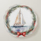 Barco-marinheiro aquoso em água azul numa coroa de Natal com arco vermelho e fundo abstrato