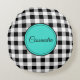 Xadrez preto e branco personalizado com moldura de acento turquesa redonda e nome, decora essa almofada redonda trendy para meditação, yoga, cadeira de escritório, cama, quarto de dormitório, etc. Altere o nome usando o modelo fornecido. A parte de trás é cinza sólido. As dimensões são 40 cm de diâmetro quando plana e 35 cm quando preenchida. 100% poliéster escovado sem rugas. Lavável na máquina, capaz de reter a cor e resistir ao encolhimento. Feito nos EUA. Veja "Sobre este produto" ao lado para mais informações.