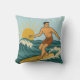 This reversible coastal blue throw pillow is the perfect addition to your beach home decor. This retro-inspired surf art features a surfer dude riding an endless wave beneath the shining sun. Designed with old-school California energy, the distressed look gives it an authentic feel, like it was pulled straight from a vintage surf shop. On the reverse is a repeating classic surfboard pattern inspired by coastal surf culture with sun-bleached boards, vintage blues, weathered yellows, and faded reds you’d see stacked outside a surf shop or leaning against a fence after a long session. Change the look depending on your mood! | Matching throw blanket available in store.