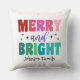 Spread holiday cheer with this colorful pillow featuring retro-style typography that boldly proclaims, “Merry and Bright,” in vibrant purple, pink, green, and blue hues. Simple accent stars add a touch of magic to the design, and the best part is that you can customize the family name to make this design uniquely your own. Step into the season with style, warmth, and a personalized touch.