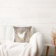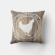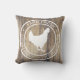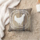 Travesseiro em estilo fazendeiro russo com um impressão de fundo de tábuas de madeira clara, um crachá fresco de fazenda circular e uma silhueta branca de galinha.