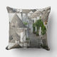 O coxim do travesseiro decorativo da foto com uma rua vazia alinhou por casas brancas tradicionais típicas do trulli do emplastro com os telhados cónicos no amanhecer na cidade italiana do sul Alberobello em Apulia, Italia.