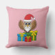 Uma ilustração de uma coruja de Papai Noel fofa com chapéu de Papai Noel vermelho e presentes verdes, vermelhos, azuis com fita amarela. Este adorável pássaro de olhos grandes com barba longa e bigode está pronto para celebrar seu Natal mágico. E você? Seus presentes estão prontos?