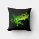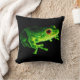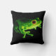 Um sapo verde fraturado com olhos laranja ferozes contra fundo preto.