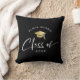 Travesseiro decorativo de graduação de nome personalizado moderno com caligrafia de script de tendência lendo CLASS sob um boné de formando dourado impresso. Personalize com seu nome em um arco e no ano de sua graduação.
