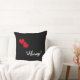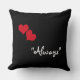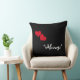 Um travesseiro decorativo preto com as palavras "Sempre" e dois pequenos corações vermelhos. Projetado por Robin D. Cox.