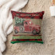 Este travesseiro temático do feriado caracteriza um caminhão vermelho do vintage que transporta uma árvore de Natal. O fundo tem uma textura de serapilheira do falso e uma xadrez vermelha e preta atrás. Personalize o nome de família com seus próprios ou para dar como um presente. Projetado pelo © Tim Coffey do artista.