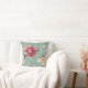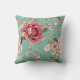 This pillow features a shabby chic design of pink and white florals on a teal background.