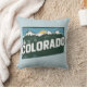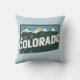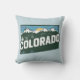 Na moda travesseiro decorativo apresenta uma silhueta retrorcaz do Estado do Colorado, com as Rockies e texto em negrito sobre fundo azul claro.